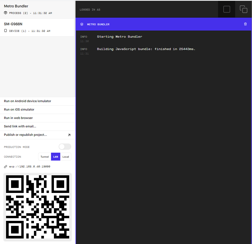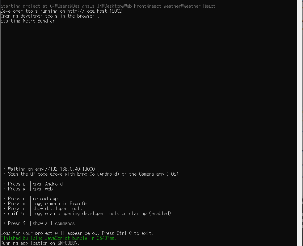 이러한 화면이 등장하며 왼쪽아래가 expo앱이나 카메라에서 qr인식을 통해 앱의 실행을 확인할 수 있다.